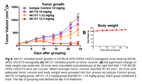 研究人员在携带MC38-hPDL1-hCD73异种移植物的C57BL/6-hPD-1/hPD-L1/hCD73转基因小鼠中研究了AK131的体内抗肿瘤活性。研究显示,AK131可显著抑制肿瘤体积生长,具有强大的抗肿瘤活性。