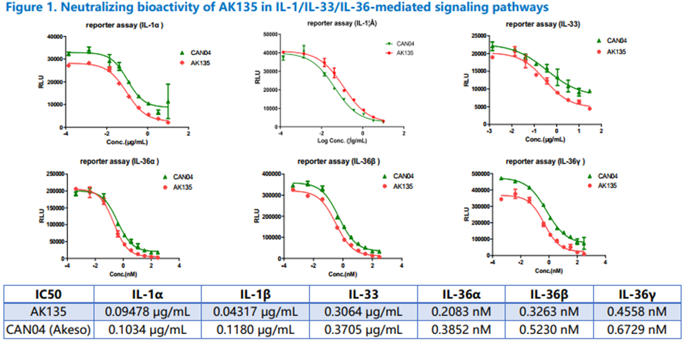 • 有效抑制信号通路:报告基因实验进一步证实,AK135能够有效抑制IL-1、IL-33和IL-36信号通路的激活,在各通路中均显示出优异的半数抑制浓度(IC50)。